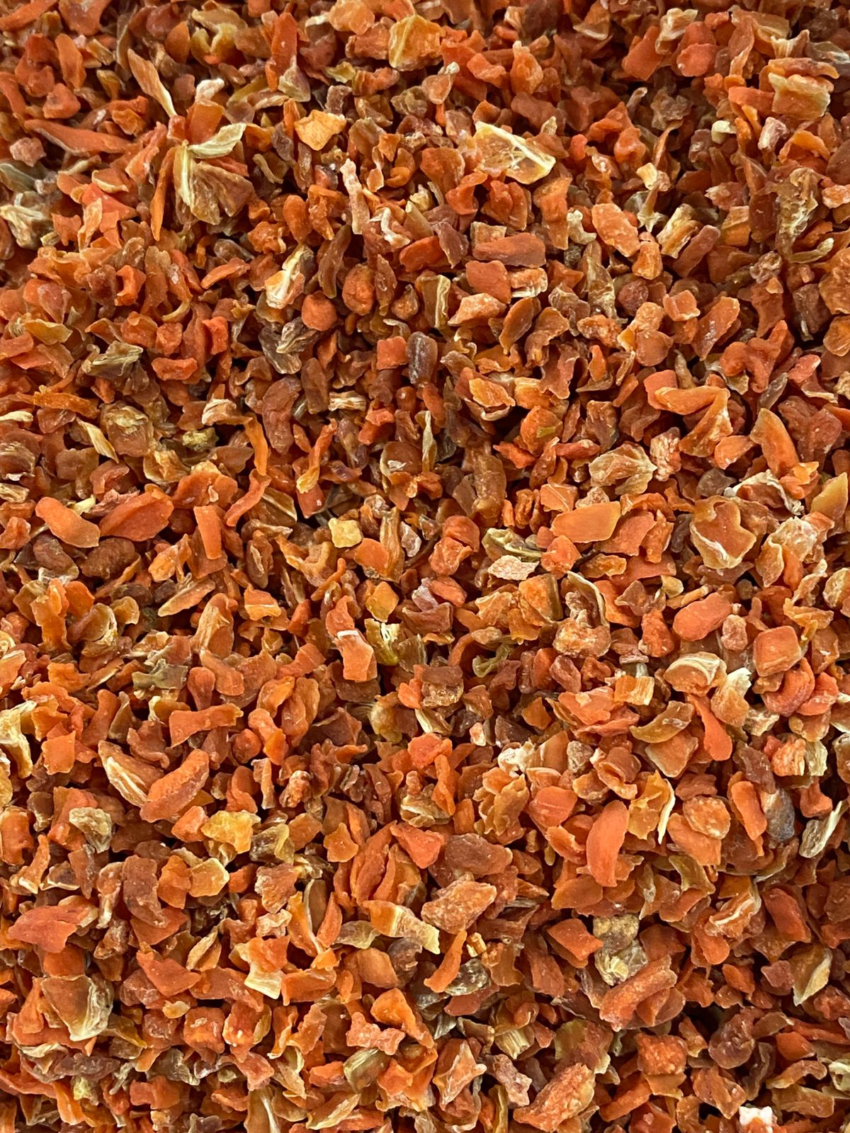 Características: Granulometria em pequenos pedaços (cubos ou flocos) de cor laranja vibrante. Possui sabor levemente adocicado e aroma suave. É uma fonte concentrada de betacaroteno (provitamina A), fibras, potássio e antioxidantes.