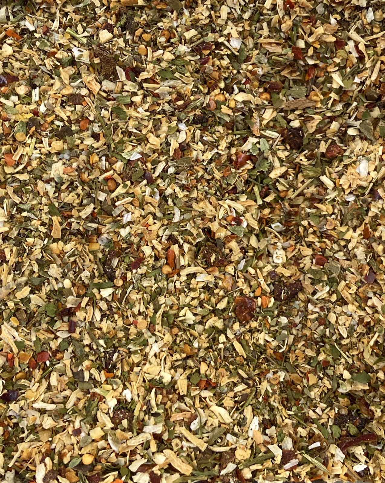 O chimichurri com pimenta desidratado é um tempero tradicional, composto por uma mistura de especiarias desidratadas, com destaque para a pimenta calabresa e vermelha, proporcionando um sabor picante e aromático. A base inclui cebola, alho, salsa, pimentão, orégano, manjericão, pimenta-do-reino, tomate, pimenta calabresa e pimenta vermelha.