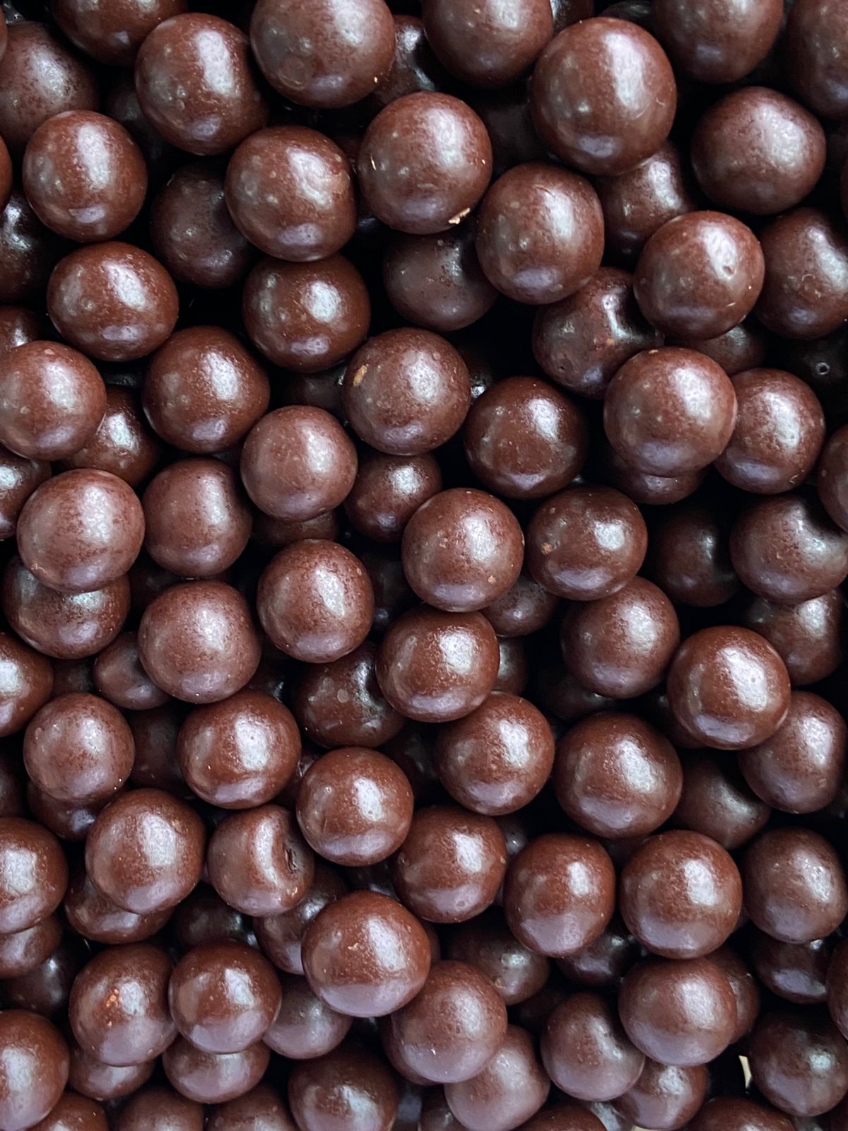 Características: Esferas crocantes cobertas por chocolate amargo de superfície lisa e brilhante. Apresenta um sabor intenso de cacau com doçura muito sutil, proporcionando uma experiência sensorial de “snack de luxo”.