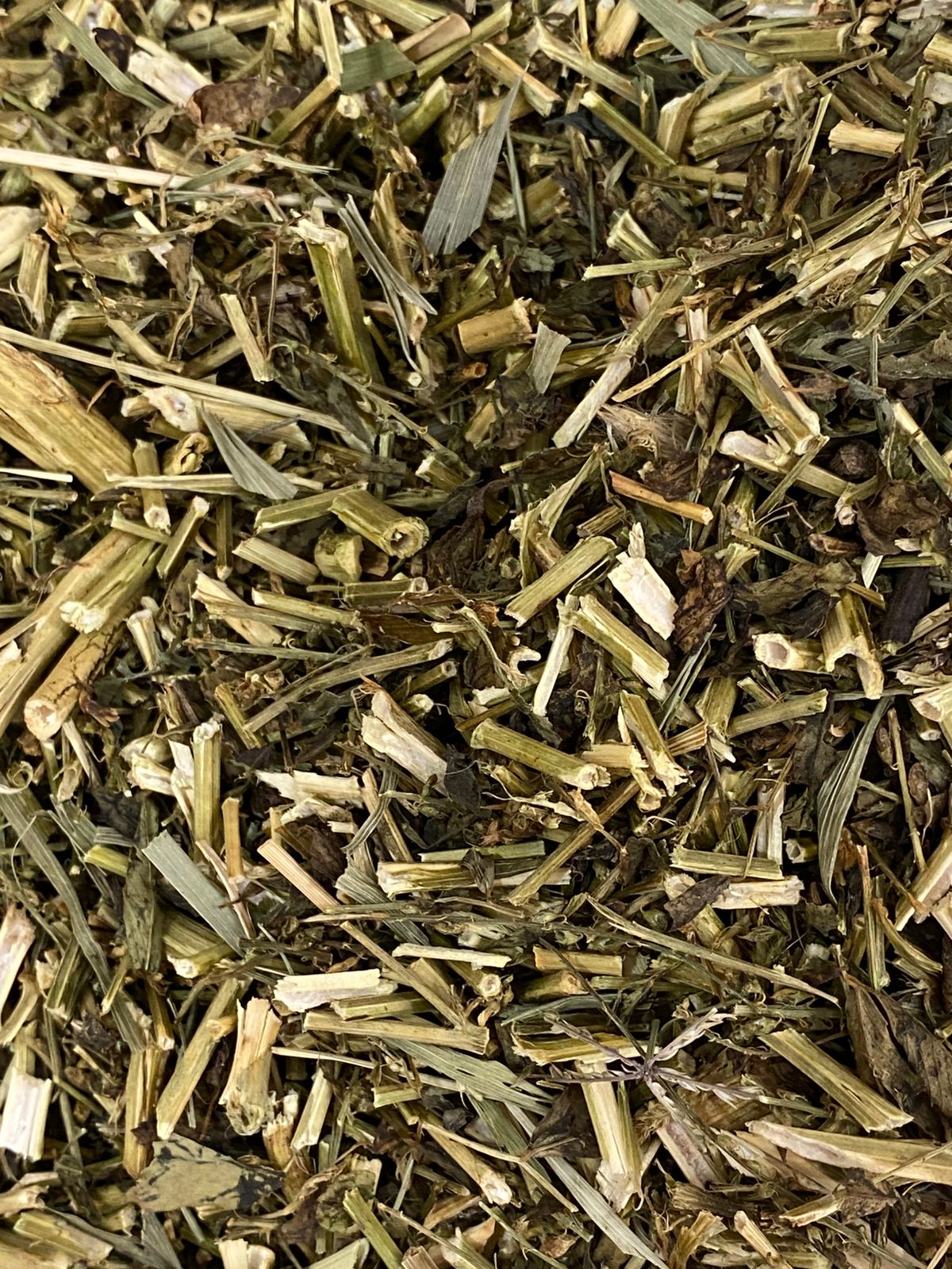 Folhas secas irregulares, de coloração verde-oliva a marrom-esverdeada