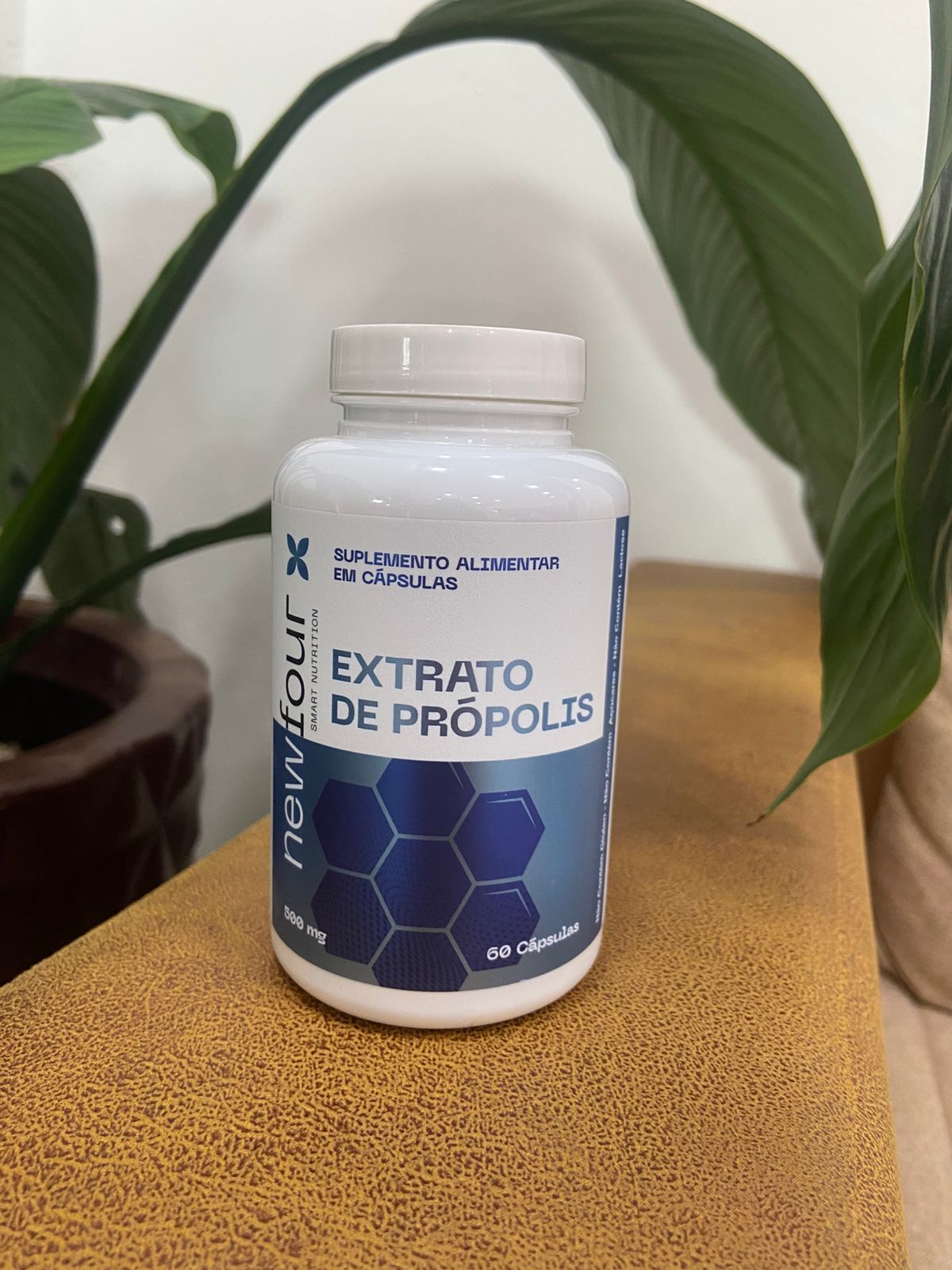 O Extrato de Própolis da New Four é um suplemento alimentar em cápsulas com extrato seco de própolis (resina produzida pelas abelhas a partir de plantas), rica em compostos bioativos como flavonoides, fenóis e terpenos, formulado para suporte imunológico natural e proteção antioxidante (500mg por cápsula, 60 cápsulas por frasco).