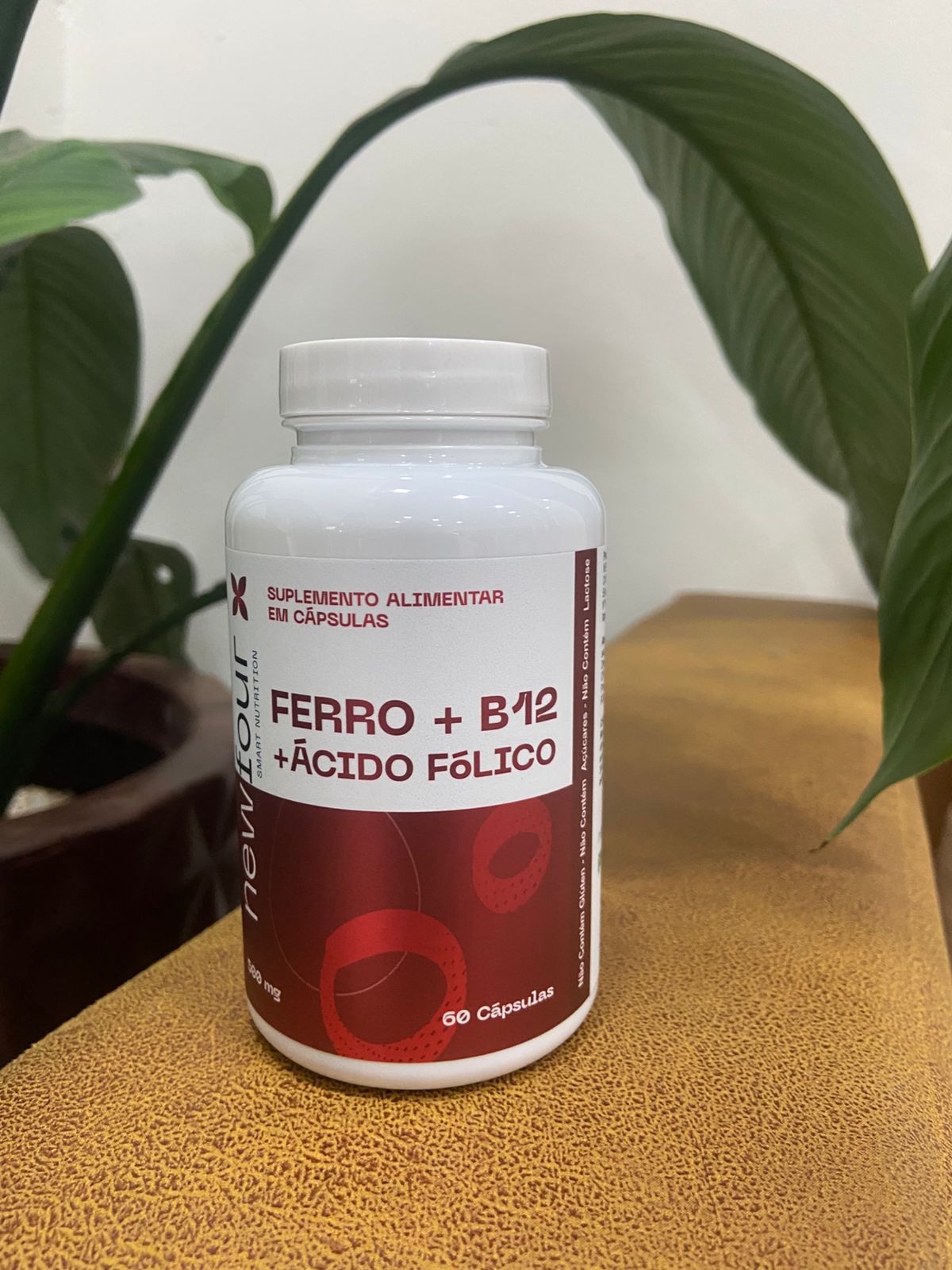 O Ferro + Vitamina B12 + Ácido Fólico da New Four é um suplemento alimentar em cápsulas que combina ferro (bisglicinato ferroso, forma de alta absorção), vitamina B12 (cianocobalamina) e ácido fólico (vitamina B9), formulado para suporte à formação de glóbulos vermelhos, prevenção de anemias e nutrição materna/fetal (500mg por cápsula, 60 cápsulas por frasco).