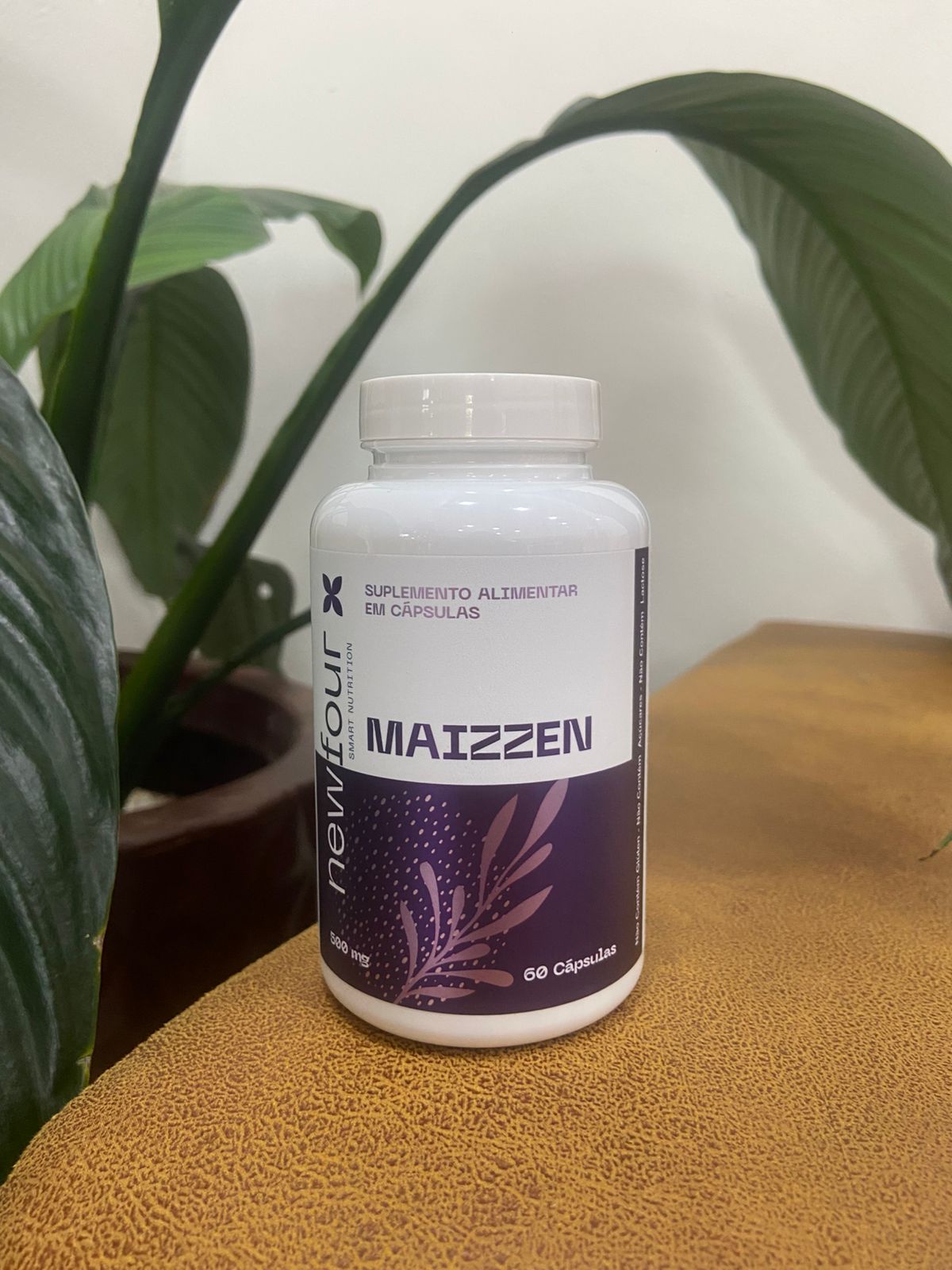 O Maizzen da New Four é um suplemento alimentar em cápsulas que combina magnésio (bisglicinato), melatonina, L-triptofano e vitamina B6, formulado para promover relaxamento, melhorar a qualidade do sono e reduzir ansiedade/estresse (nota: alguns anúncios indicam 600mg, mas segue o padrão de 500mg/porção conforme sua consulta; 60 cápsulas por frasco).