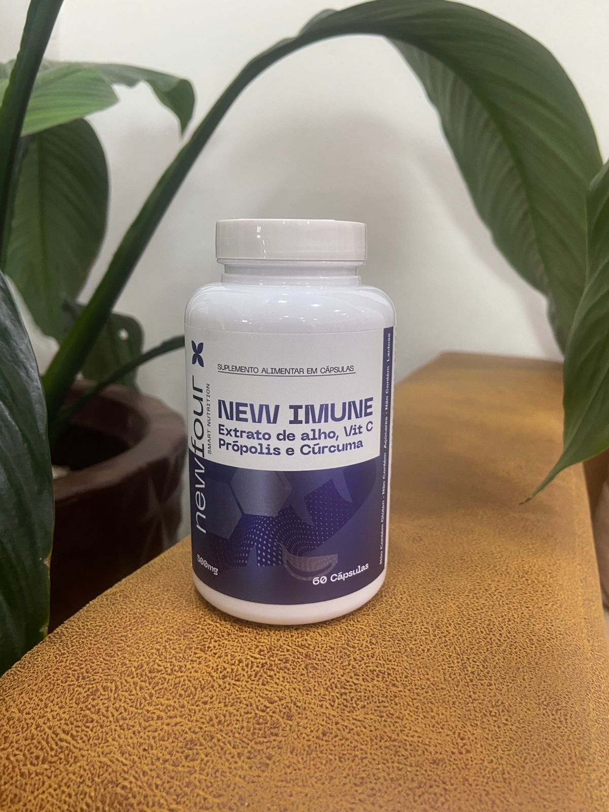 O New Imune da New Four é um suplemento alimentar em cápsulas que combina extrato de alho, vitamina C, própolis e cúrcuma, formulado para fortalecer as defesas naturais do organismo, com ação antioxidante e anti-inflamatória (500mg por cápsula, 60 cápsulas por frasco).