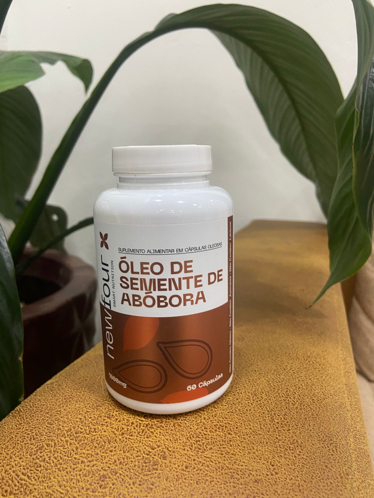 O Óleo de Semente de Abóbora da New Four é um suplemento alimentar em cápsulas com óleo prensado a frio de sementes de abóbora (Cucurbita pepo), rico em ácidos graxos insaturados (ômega-6 e ômega-9), fitosteróis, zinco, vitamina E e antioxidantes, formulado para suporte à saúde da próstata, urinária, hormonal e cardiovascular (1000mg de óleo por cápsula, 60 cápsulas por frasco).