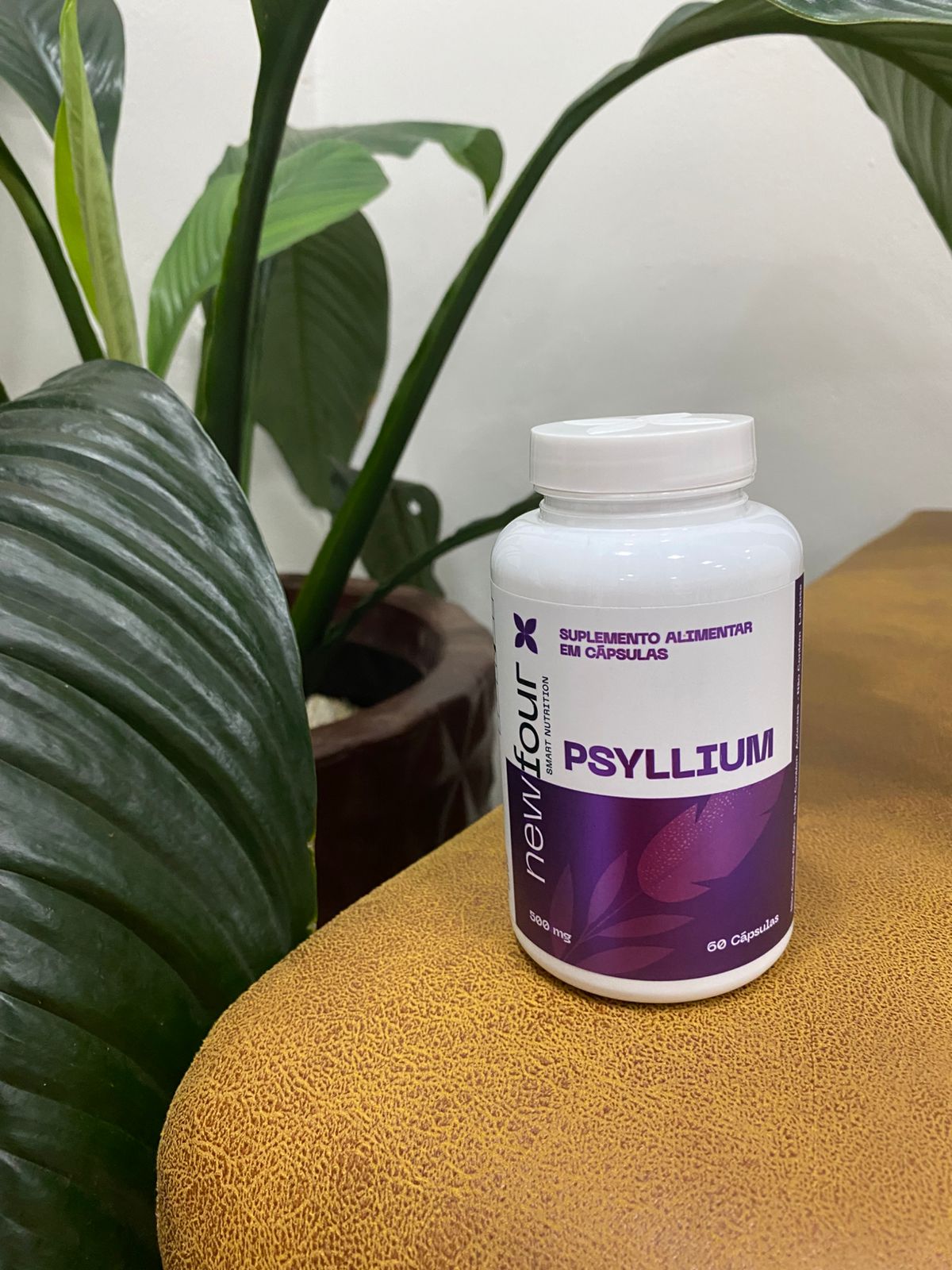 O Psyllium da New Four é um suplemento alimentar em cápsulas com 100% de casca de psyllium (Plantago ovata), uma fibra solúvel natural de alta viscosidade, formulado para suporte à saúde intestinal, regulação do trânsito e controle de peso (500mg por cápsula, 60 cápsulas por frasco).