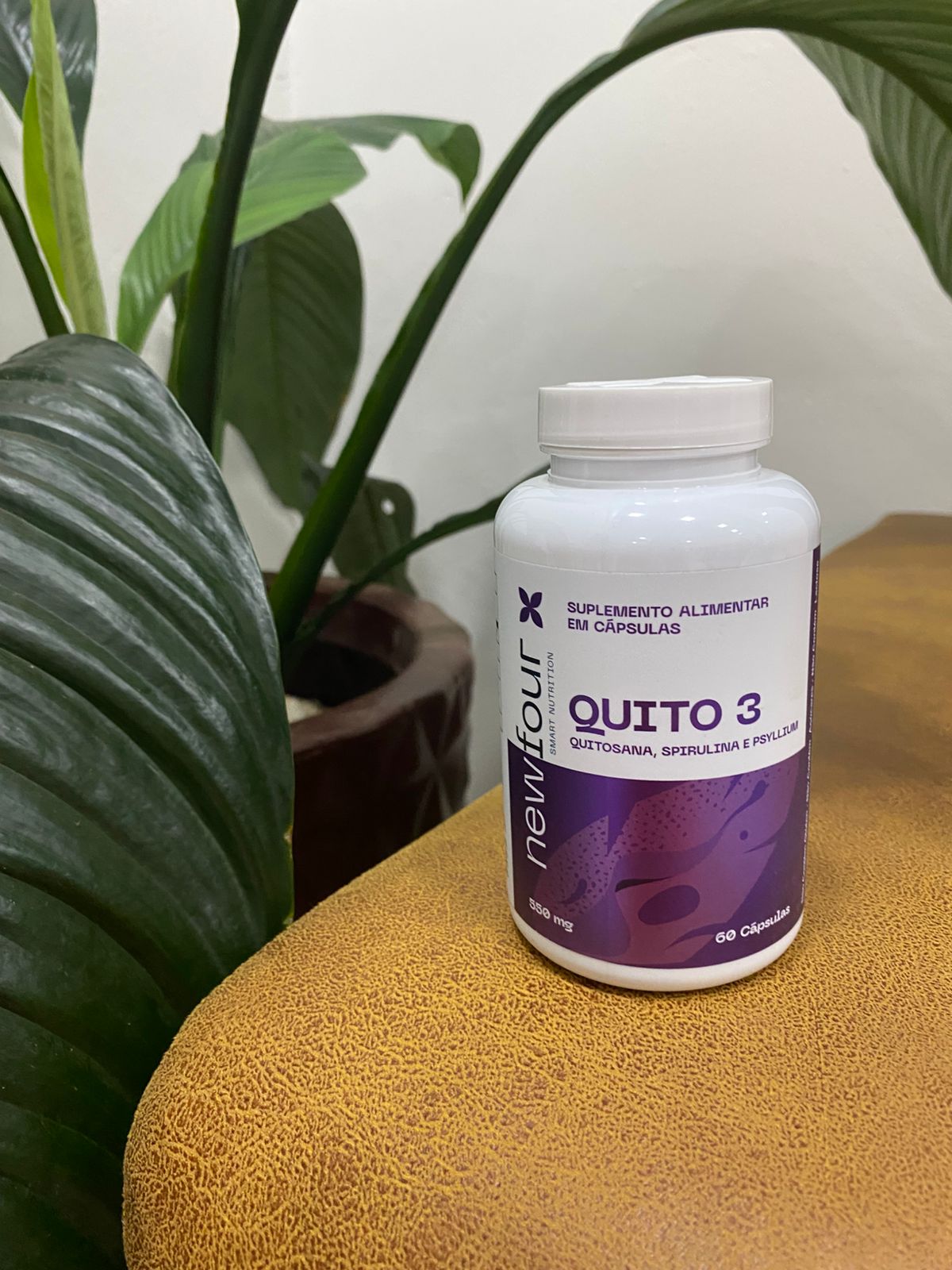 O Quito 3 da New Four é um suplemento alimentar em cápsulas que combina quitosana (derivado da quitina de crustáceos), spirulina (microalga nutritiva) e psyllium (fibra solúvel de Plantago ovata), formulado para suporte ao controle de peso, regulação intestinal e nutrição complementar (550mg por cápsula, 60 cápsulas por frasco – variações comuns listam 500mg, mas segue o padrão da linha).