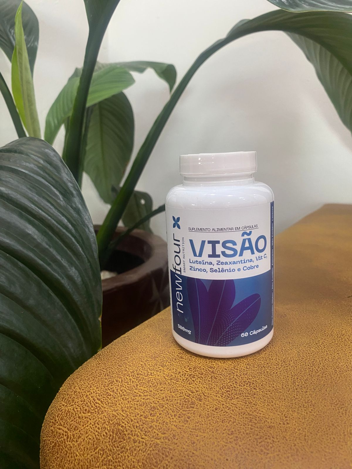 O Visão da New Four é um suplemento alimentar em cápsulas formulado especificamente para suporte à saúde ocular, combinando luteína e zeaxantina (carotenoides naturais da flor de Tagetes erecta) com vitamina C, zinco, selênio e cobre, para proteção antioxidante contra danos da luz azul, radicais livres e envelhecimento ocular (500mg por cápsula, 60 cápsulas por frasco).