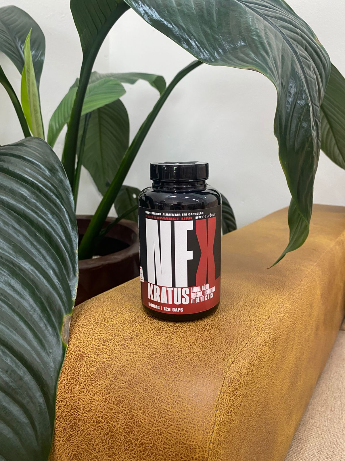 O NFX KRATUS é um suplemento pré-treino em cápsulas da linha NFX (New Four), com 640mg por porção (aprox. por cápsula ou dose indicada), combinando cafeína, cálcio, tirosina, L-carnitina, vitaminas B6 e B3, e TCM (triglicerídeos de cadeia média) para energia explosiva e desempenho otimizado.