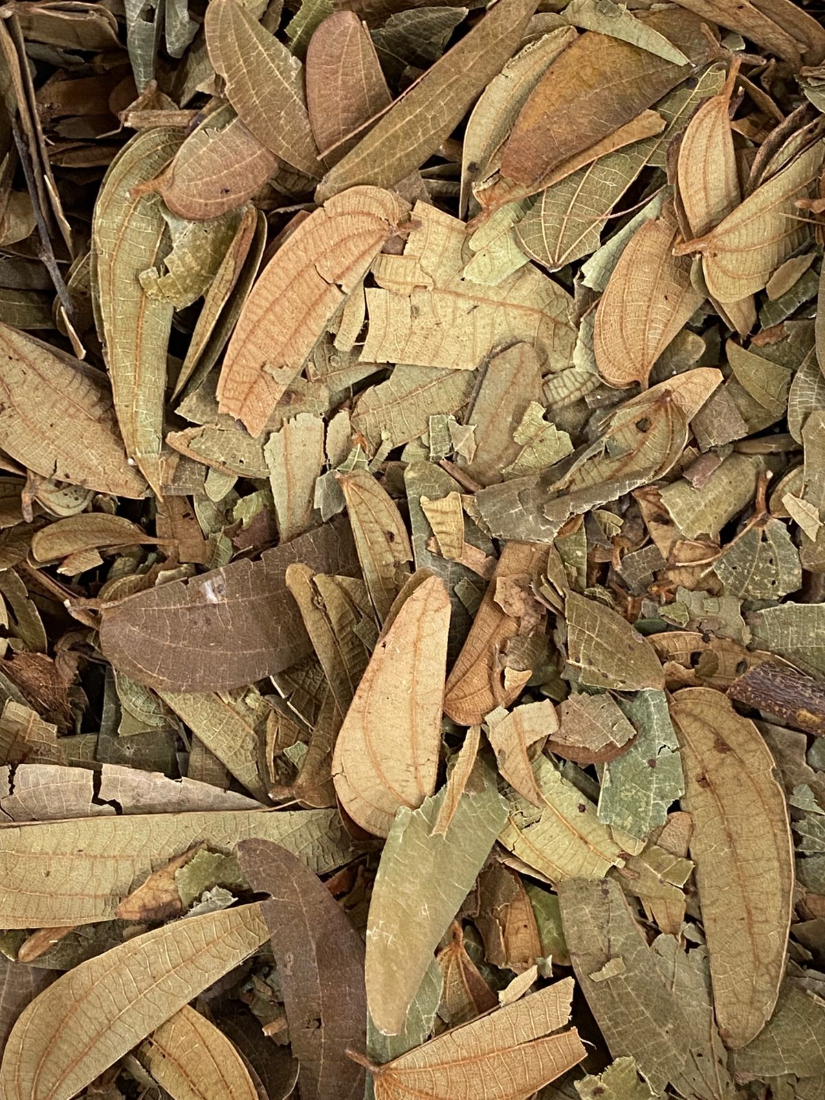 Folhas secas grandes, partidas ao meio, de coloração verde-acinzentada a marrom-claro