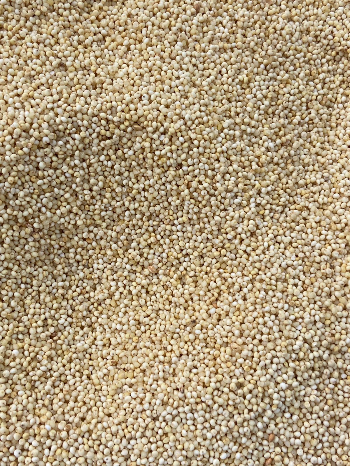Grãos de painço (Panicum miliaceum) selecionados e descascados, prontos para consumo humano. É um cereal naturalmente isento de glúten, de fácil digestão e rico em proteínas, fibras, magnésio e fósforo. Possui um sabor suave e uma textura versátil após a cozedura.