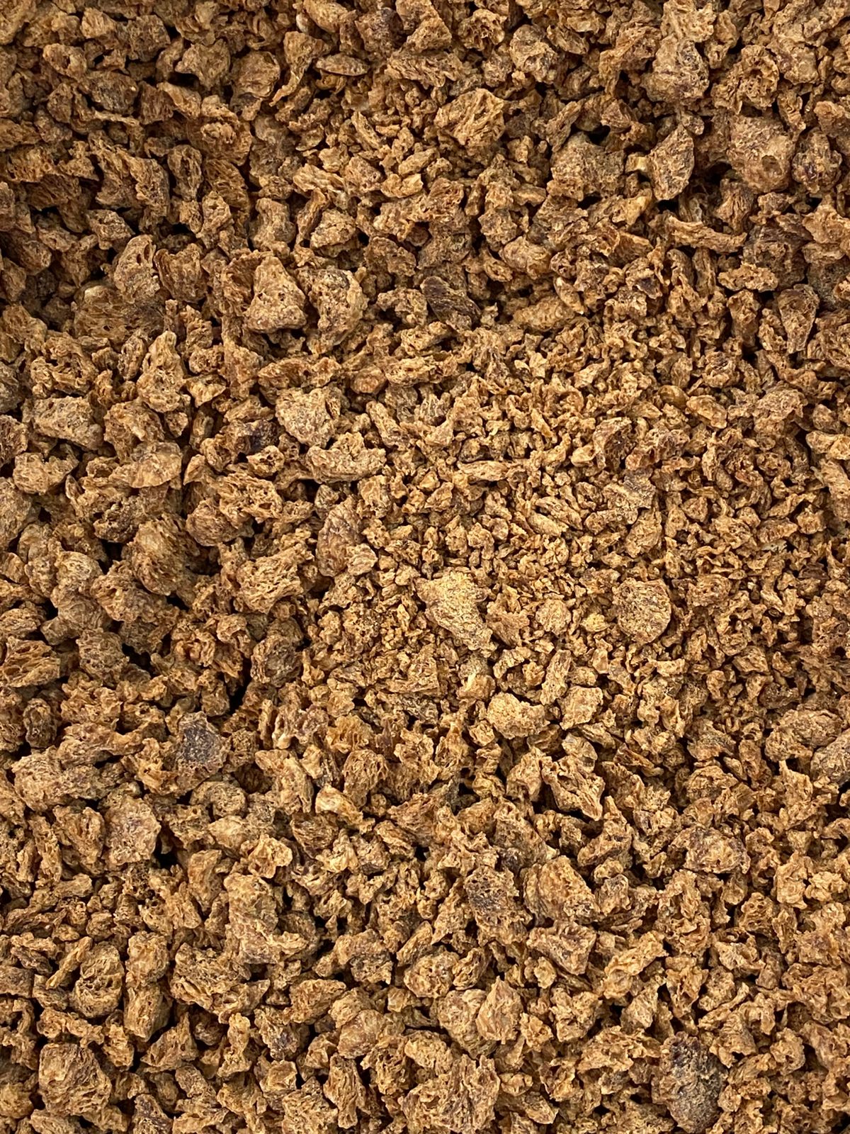 Descrição Técnica: Proteína vegetal obtida através da extrusão termoplástica da farinha de soja desengordurada. Esta versão “miúda” possui uma granulometria reduzida, ideal para substituir a carne picada. A coloração escura é obtida através da adição de corante natural de caramelo, conferindo uma aparência mais próxima da carne bovina após a cocção. Possui uma textura esponjosa que absorve marinadas e temperos com facilidade, tornando-se uma base versátil para pratos vegetarianos e veganos.