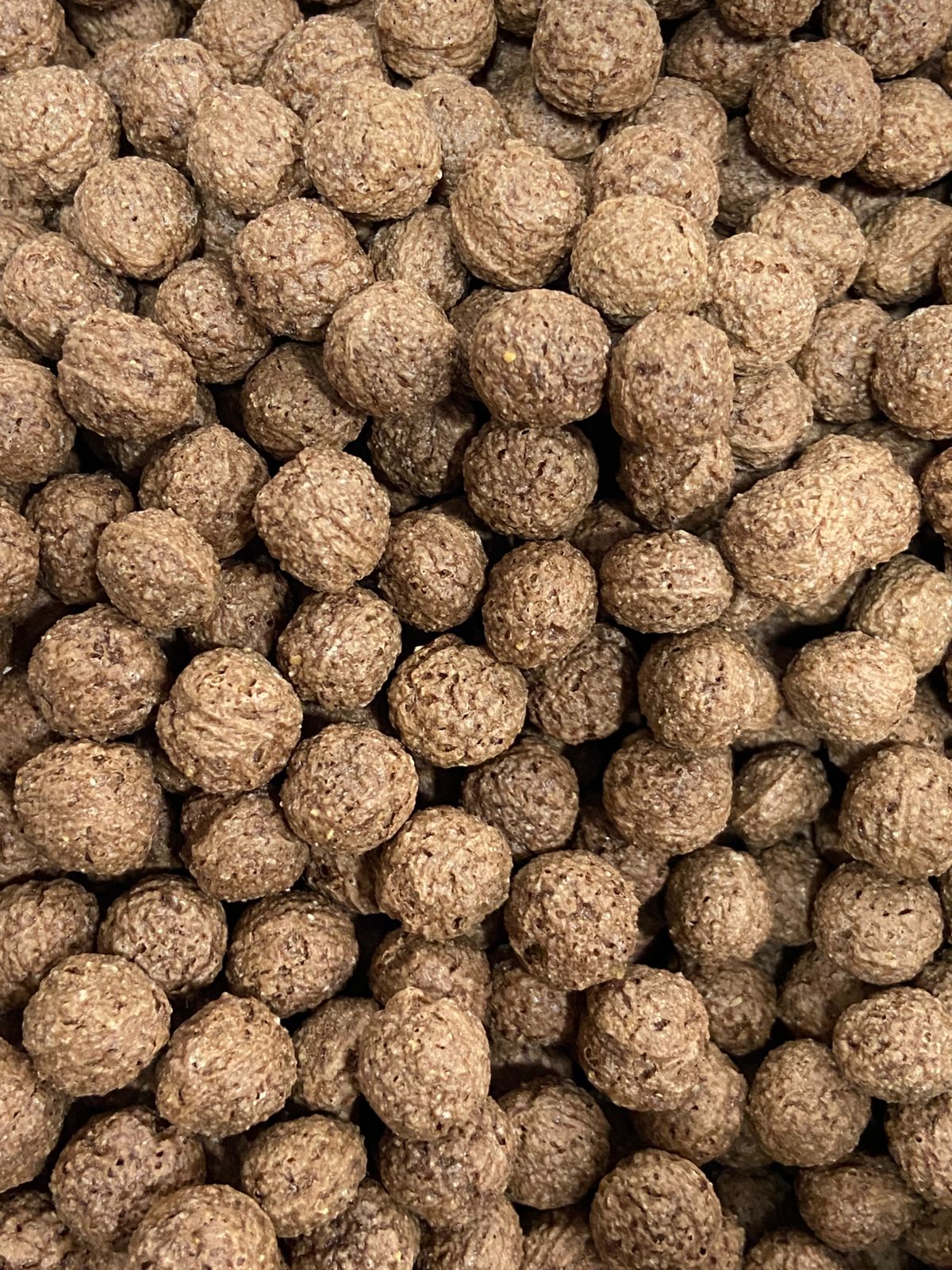 Descrição Técnica: Cereal matinal produzido através de um processo de extrusão que molda a mistura de milho e cacau em pequenas esferas uniformes. Esta geometria permite uma maior densidade do produto e uma crocância mais persistente em comparação com os flocos tradicionais. O acabamento é feito com uma camada protetora de açúcar e cacau que, ao entrar em contacto com o leite, cria um caldo achocolatado rico, mantendo o núcleo da esfera crocante por mais tempo.